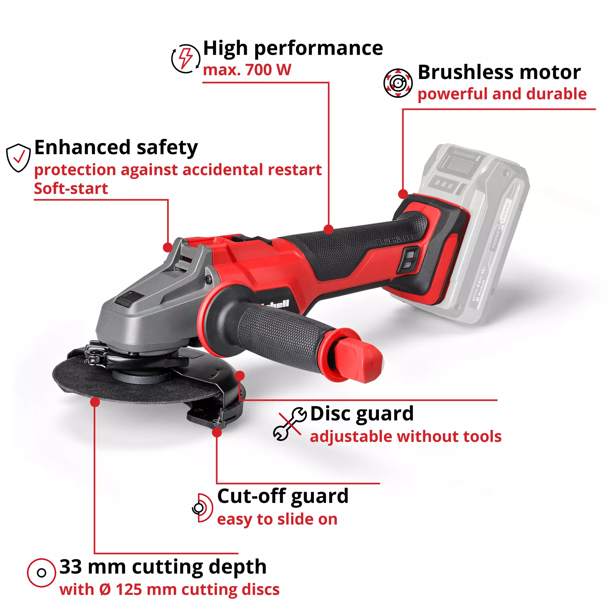 Opis artiklaAkumulatorska brusilica Einhell Axxio je praktičan alat kada radite u radionici, kući ili garaži. Moćni bežični i jednostavni za rad – to su osobine koje su visoko navedene u listi kriterijuma dizajna. Ugaona brusilica je deo familije proizvoda Power X-Change, gde se baterija može koristiti na svim uređajima iz serije. 2,6 Ah Plus baterija i baterije sa većim performansama pružaju optimalne rezultate. Motor bez četkica nudi veću snagu i duži vek trajanja. Funkcija za lagan start i zaštita od ponovnog pokretanja čine ga sigurnijim za korištenje. U međuvremenu, udoban rad je obezbeđen tankim dizajnom sa ergonomskim mekanim držanjem i dodatnom ručicom protiv vibracija. Odvajanje motora i zupčanika omogućuje nesmetano funkcionisanje, a brzo prilagođavanje zaštitnika sečenja omogućuje fleksibilno funkcionisanje. Za fleksibilnost dodatna ručka može se montirati na dva položaja. Bežična ugaona brusilica opremljena je zaštitom od preopterećenja, a robusno aluminijumsko kućište je dizajnirano za dug životni vek. Ovaj proizvod dolazi bez baterije ili punjača. Slično tome, odgovarajuće sečenje (prečnik diska 125 mm) sotupni su odvojeno.