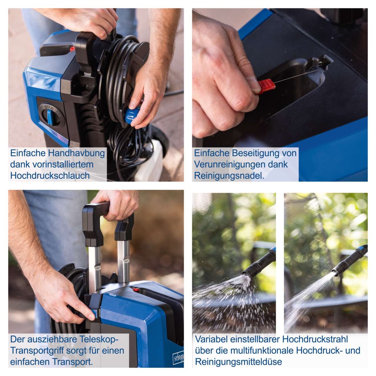 Scheppach HCE3000 električni perač visokim pritiskom savršen je dodatak za kuću, dvorište ili gradilište. Snažni motor snage 2400 W stvara maksimalni pritisak od 180 bara, čime pouzdano uklanja tvrdokornu prljavštinu, alge ili mahovinu sa prilaza, površina, terasa, vozila ili vrtnog namještaja. Mlaz visokog pritiska može se podešavati pomoću višenamjenske mlaznice za visoki pritisak i deterdžent, a radni pritisak prikazuje se na dršci pištolja. Automatsko uključivanje i isključivanje motora dodatno smanjuje potrošnju vode i energije.