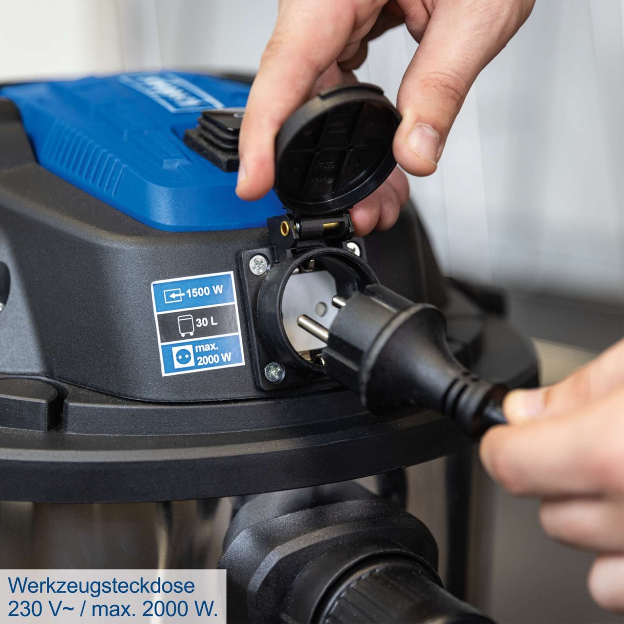 Ručna funkcija čišćenja filtera obezbeđuje konstantne performanse, a ugrađena utičnica za alat (do 2000 W) čini ovaj model idealnim partnerom za rad sa električnim alatima.